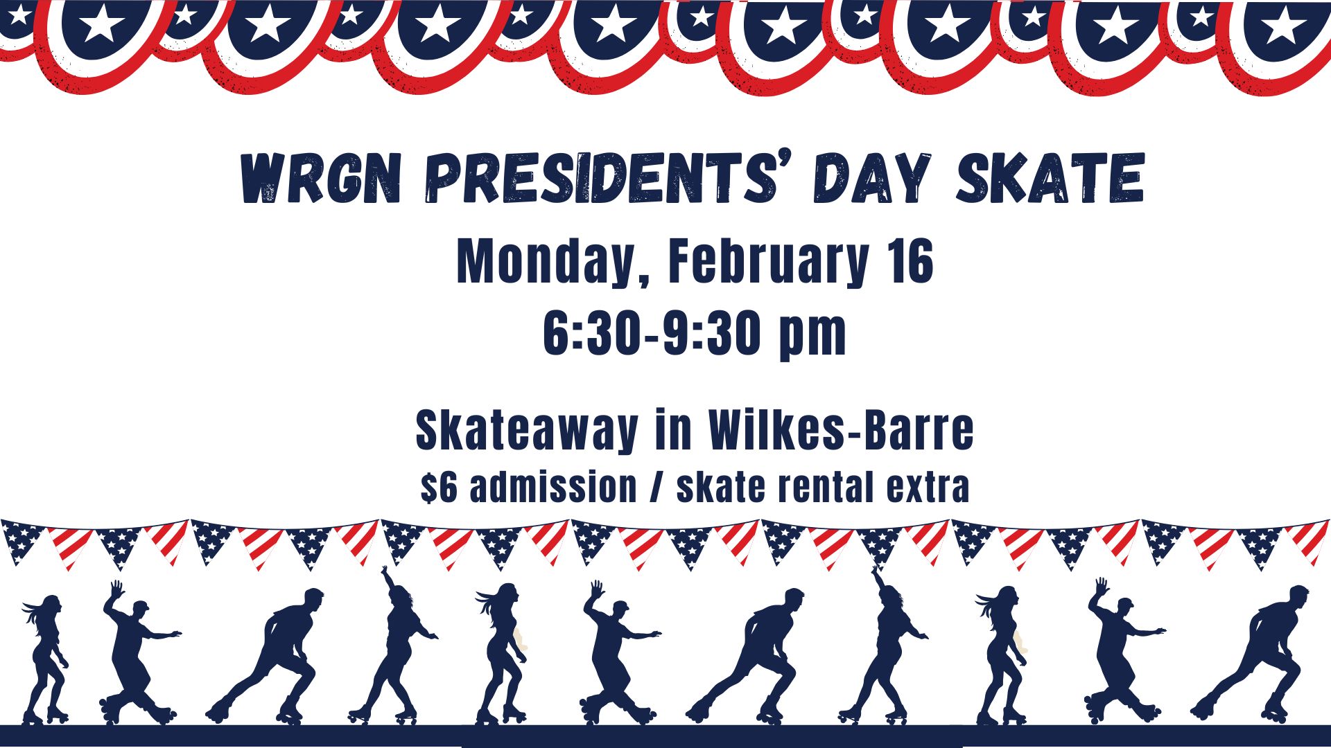 Join WRGN for our 35th Annual Presidents’ Day Skate on Monday, February 16 from 6:30 – 9:30 pm at Skateaway, Blackman Street, Wilkes-Barre